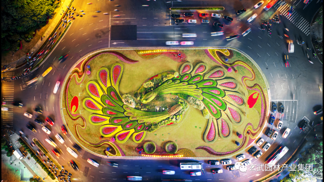 以“喜迎二十大,奮進(jìn)新征程”為設(shè)計(jì)主題;在保留孔雀主體綠雕的情況下,圍繞其四周采用繽紛的造型花柱、飄揚(yáng)的紅旗、科技感的“城市背景”及精致飄逸的植物花帶結(jié)合,演繹百年征程、筑夢(mèng)未來(lái)?;◣г煨蛢?nèi)含“2022”亮化展示,“城市背景”展現(xiàn)在飄揚(yáng)的紅旗上,表達(dá)南京人民喜迎黨的二十大勝利召開(kāi),也展現(xiàn)了在黨的堅(jiān)強(qiáng)領(lǐng)導(dǎo)下人民奮進(jìn)新征程,建功新時(shí)代的豪情和信心。